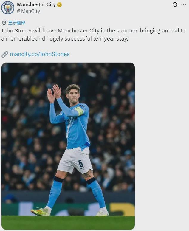 官方:曼城宣布斯通斯将在今夏离队,结束他10年的蓝衣生涯。